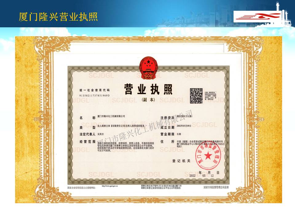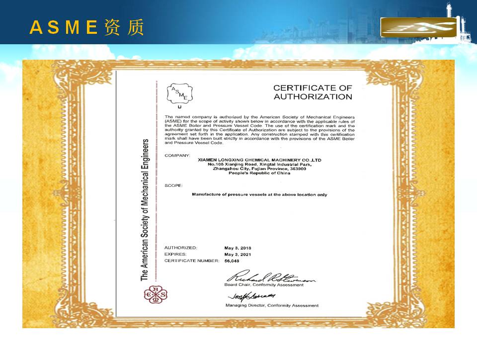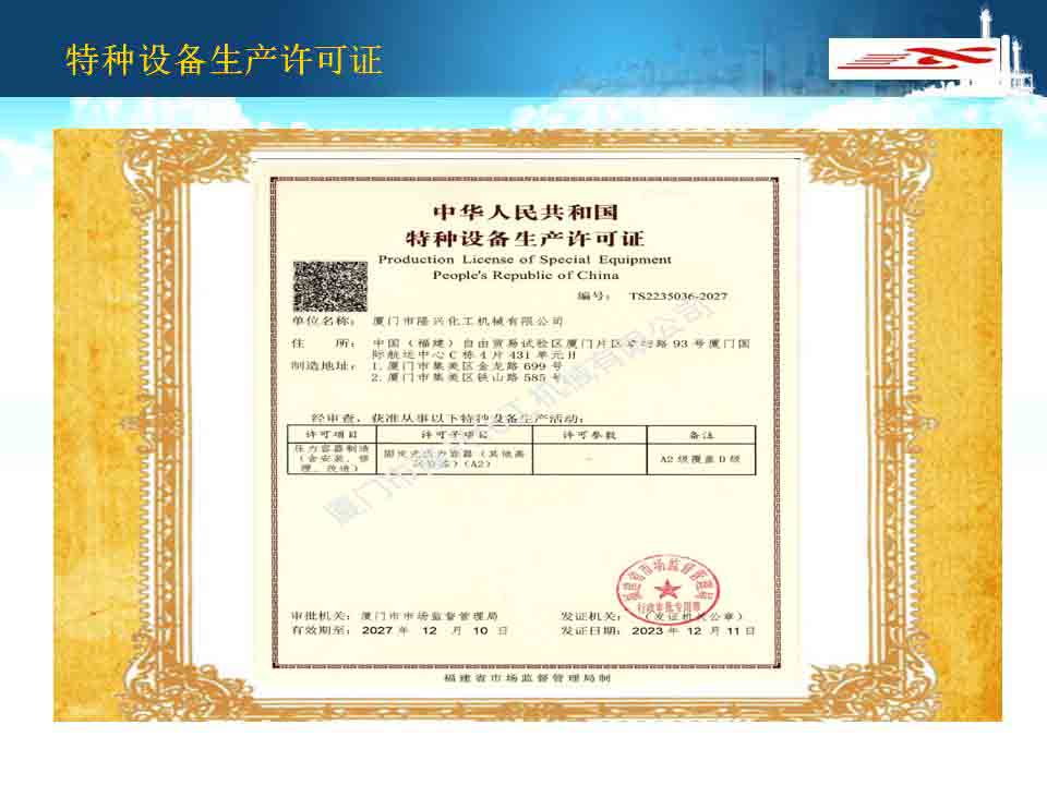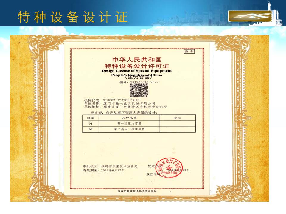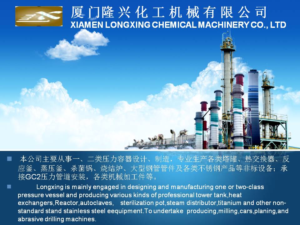 廈門隆興化工機械有限公司成立于2001年5月,占地面積30000平方米,擁有生產(chǎn)車間面積10000平方米及相關配套的辦公場所3000平方米,其中下料場所1000平方米,不銹鋼制作場所2000平方米,ASME產(chǎn)品制作區(qū)域1200平方米,無損曝光室30平方米。公司有職工135人,擁有專業(yè)的技術人員和管理人員36人。公司主要從事設計、制造A2級覆蓋D類壓力容器...